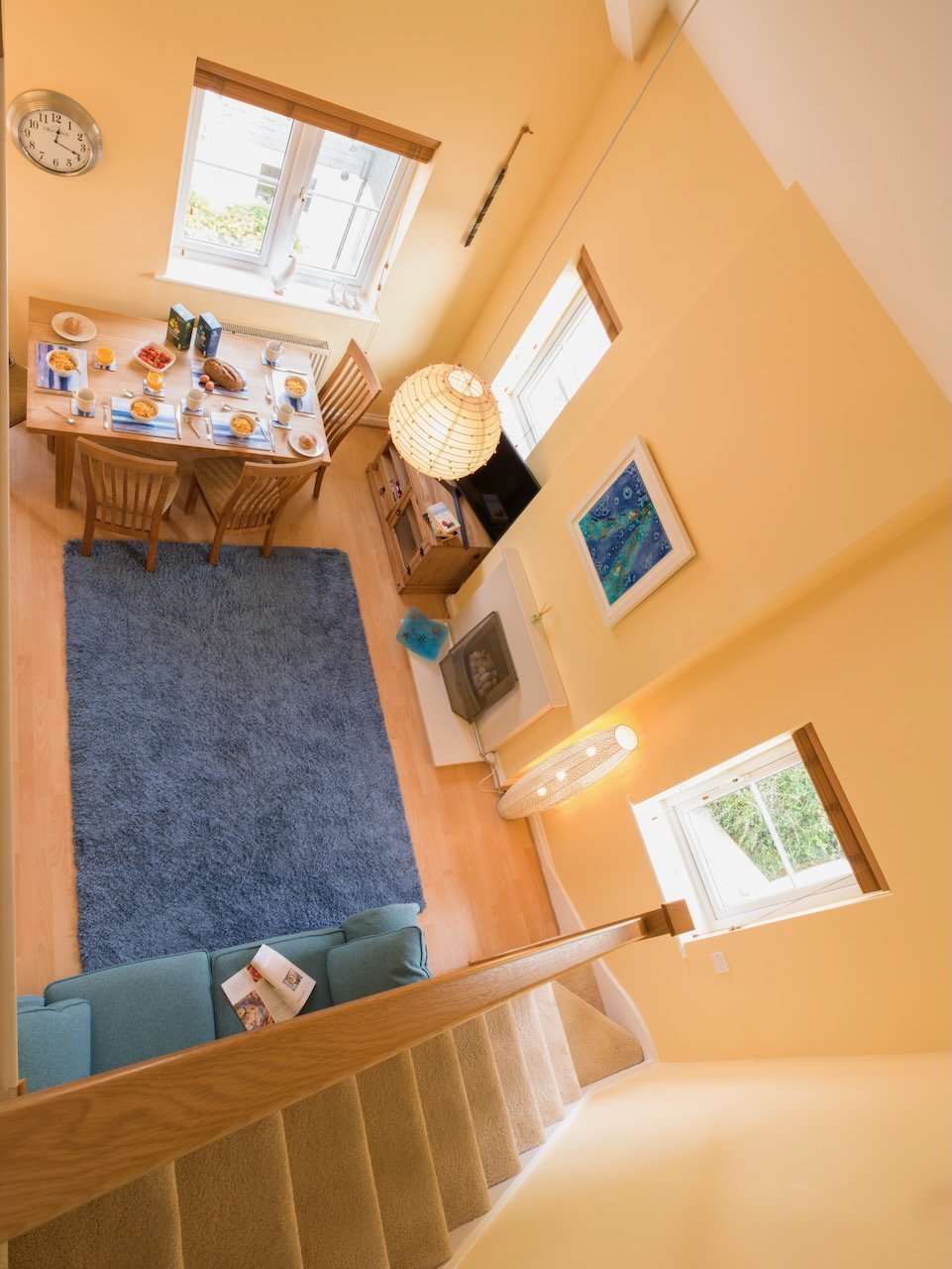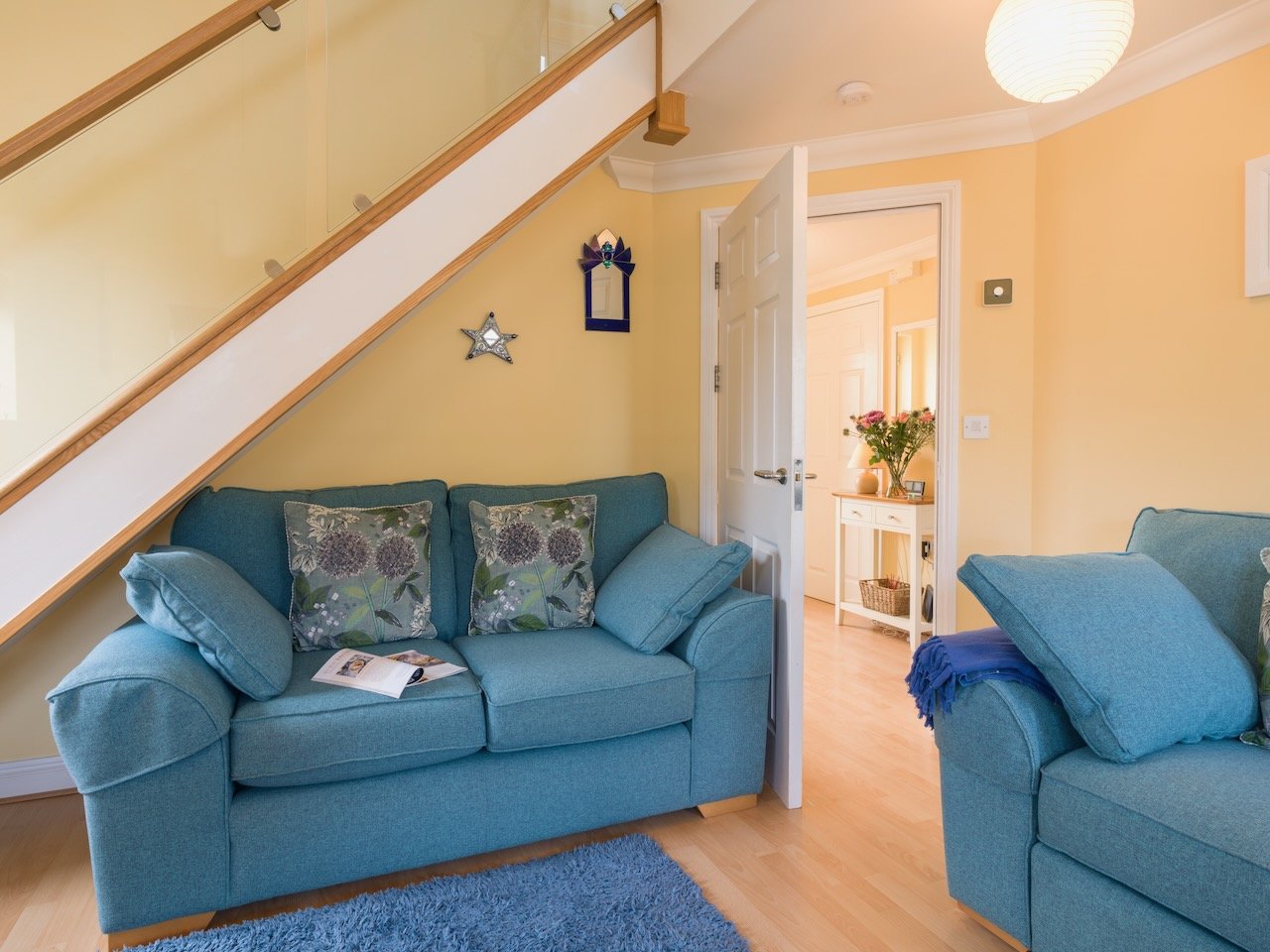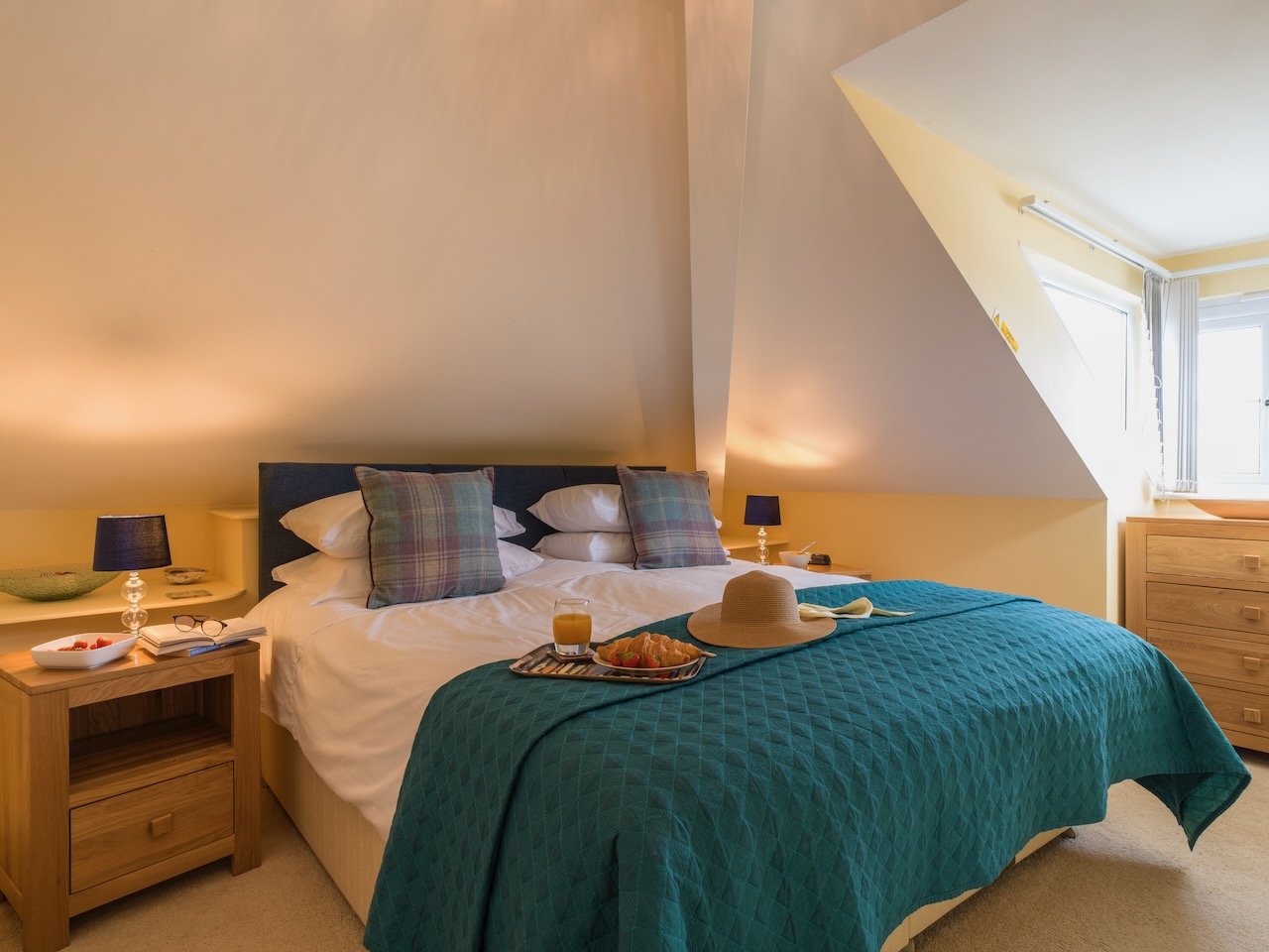 Upstairs, a mezzanine level bedroom features a comfy king-sized bed, tucked away in a light and airy setting. Outside the front, a small patio area gives you another sunny spot to sit back and unwind.