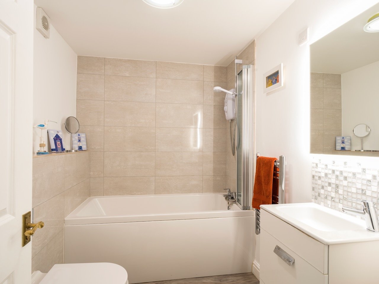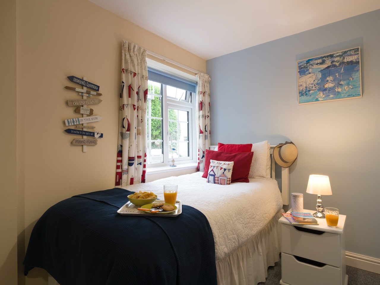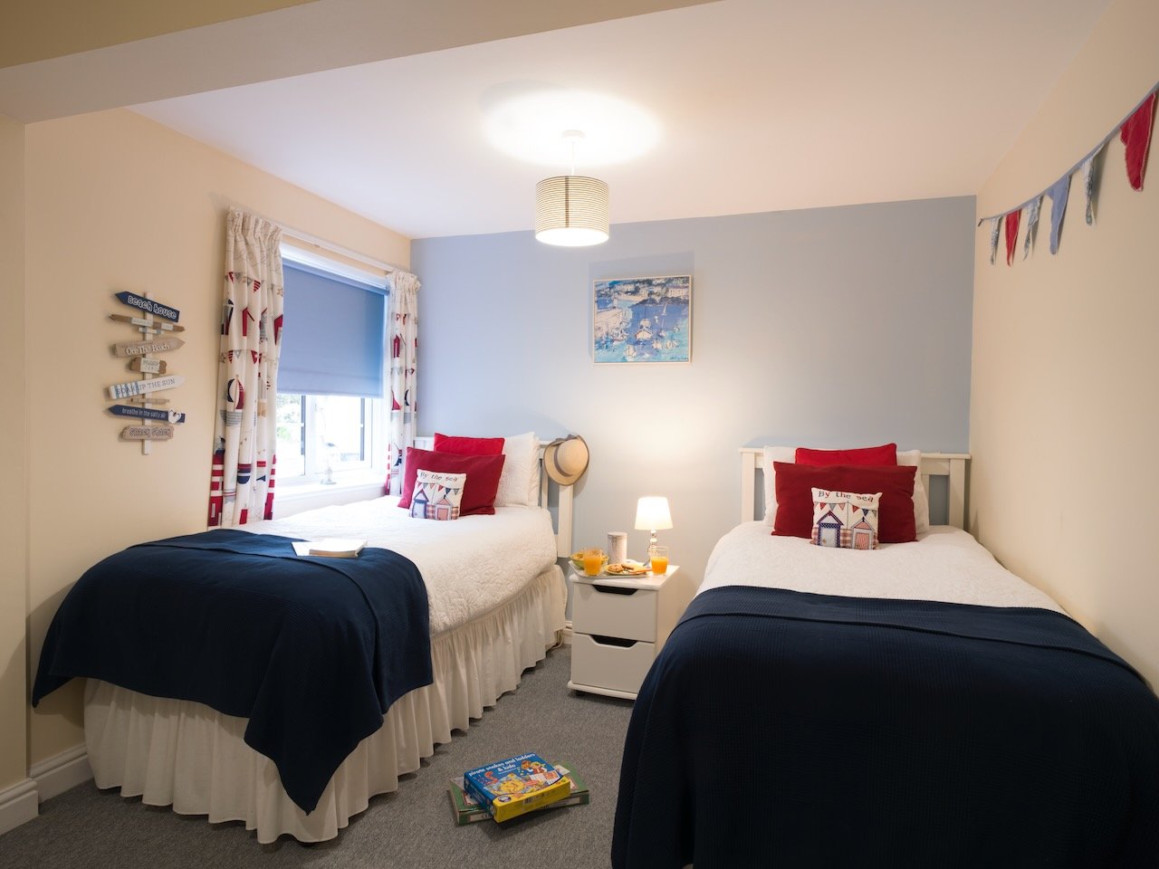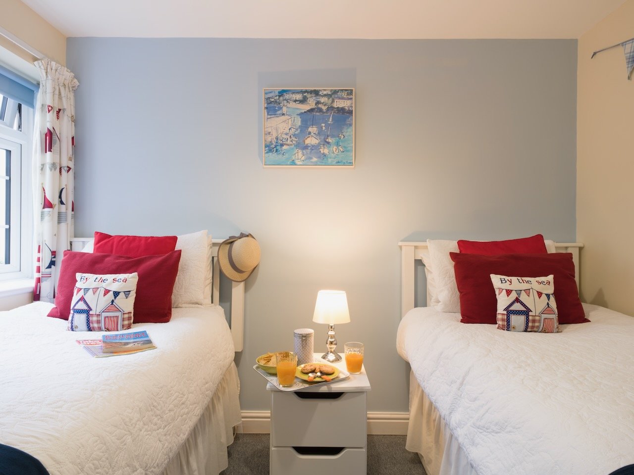 A few steps in via your private entrance. Inside, the hallway opens onto a generous family bathroom with a bath and overhead shower β ideal for unwinding after a day exploring the Cornish coastline. The twin bedroom provides two cosy single beds, making it perfect for children, friends, or extended family.